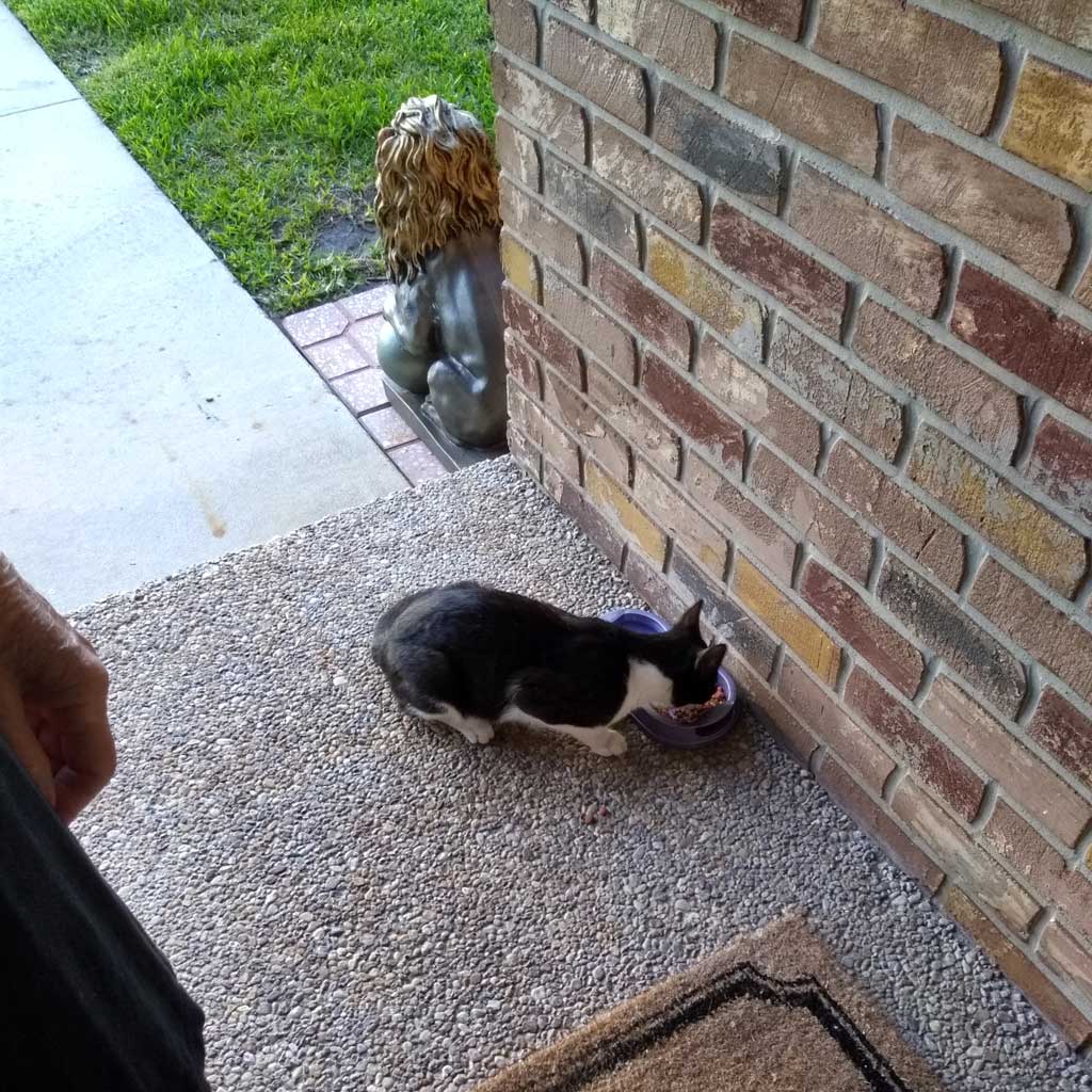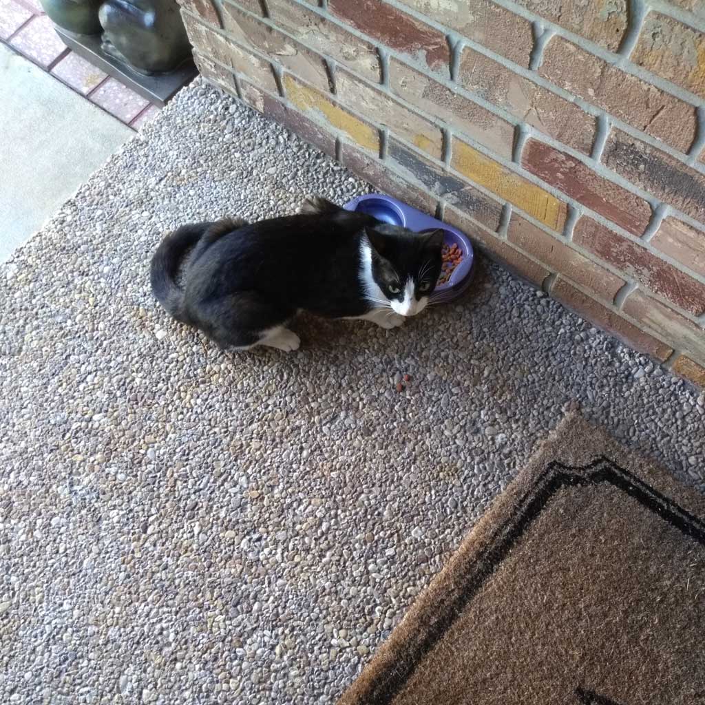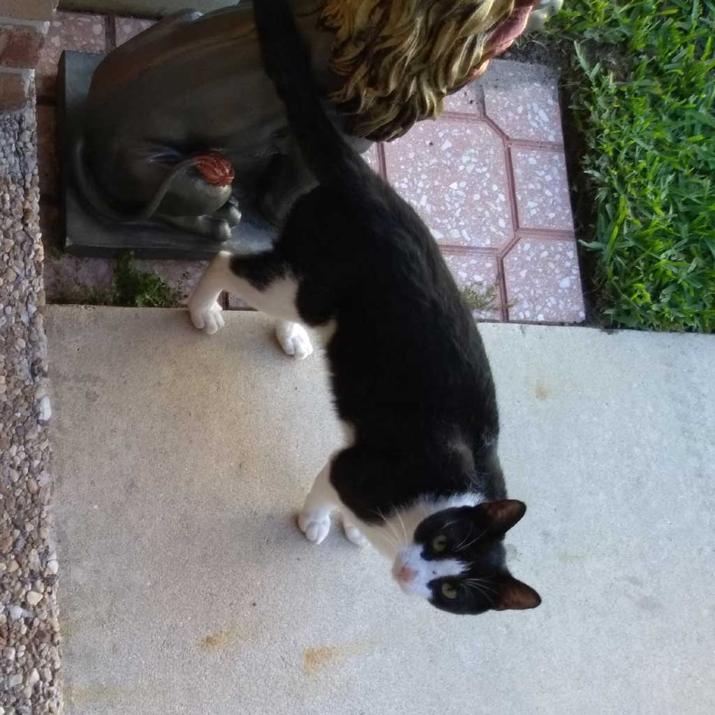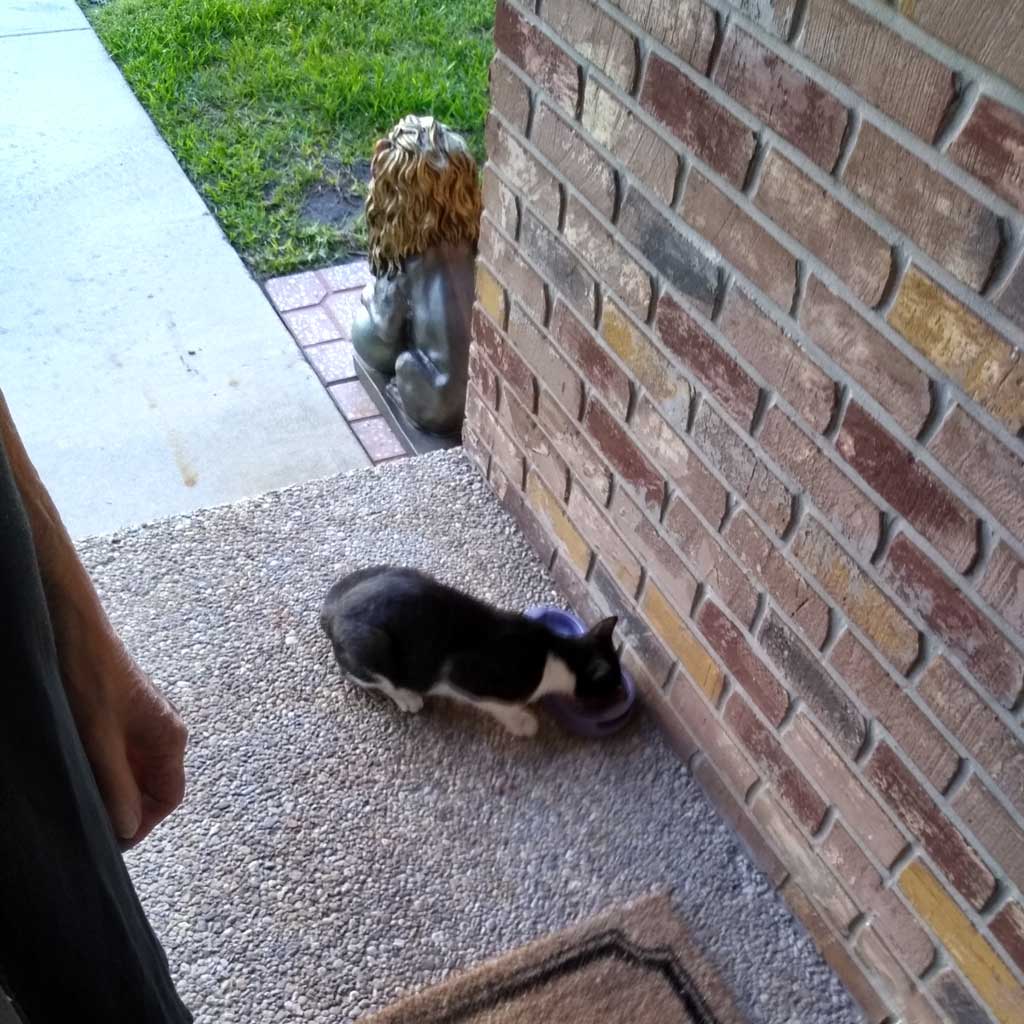 This darling kitty has been roaming our neighborhood since May. She is obviously looking to be adopted, and would make a wonderful companion for someone. We put food out for her in the morning about 7am and in the evening between 5 and 7pm because we want to be sure she has enough to eat. Unfortunately, we are not able to take her in, although she keeps trying to enter our front door.