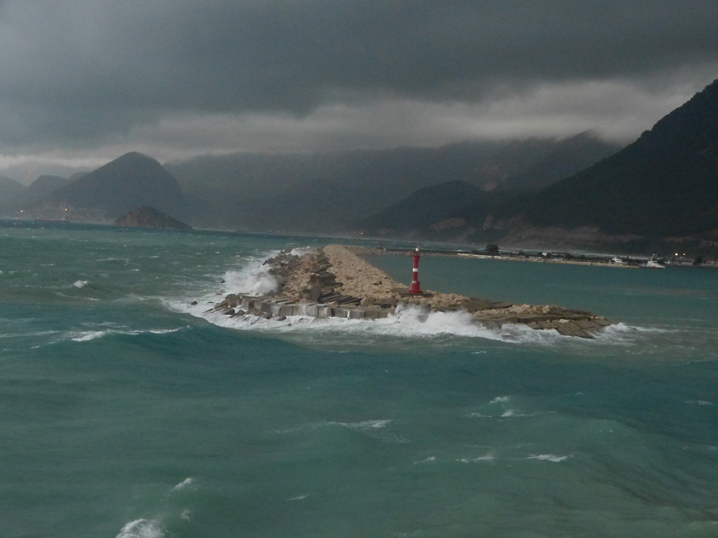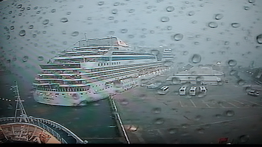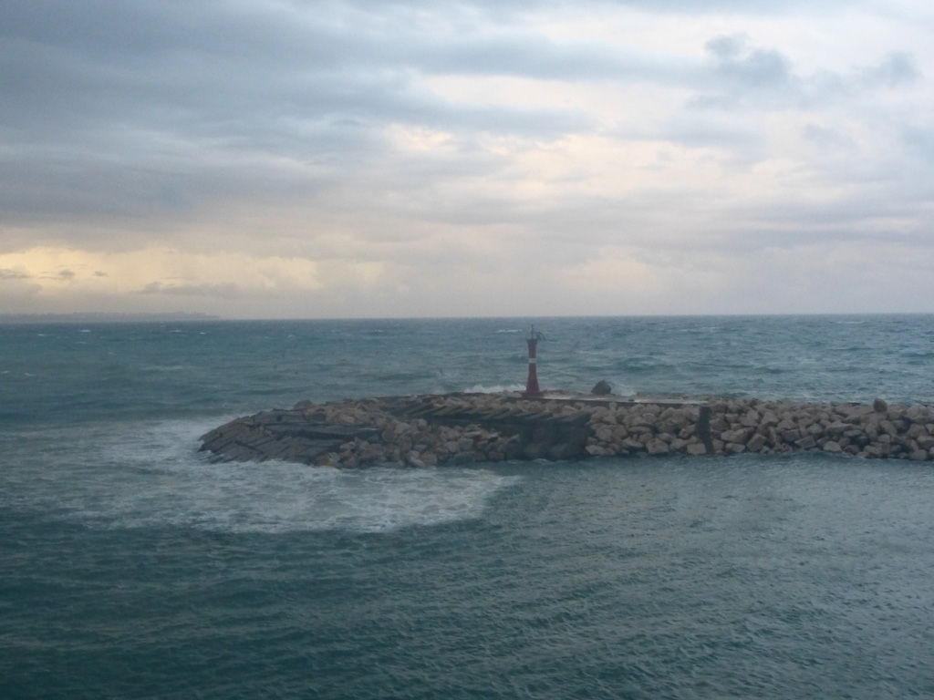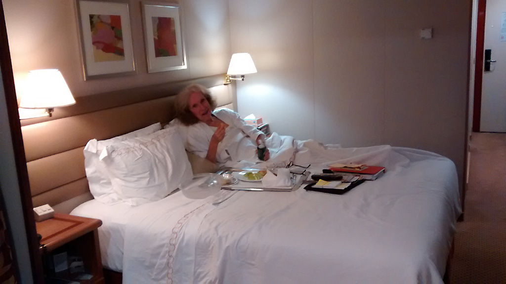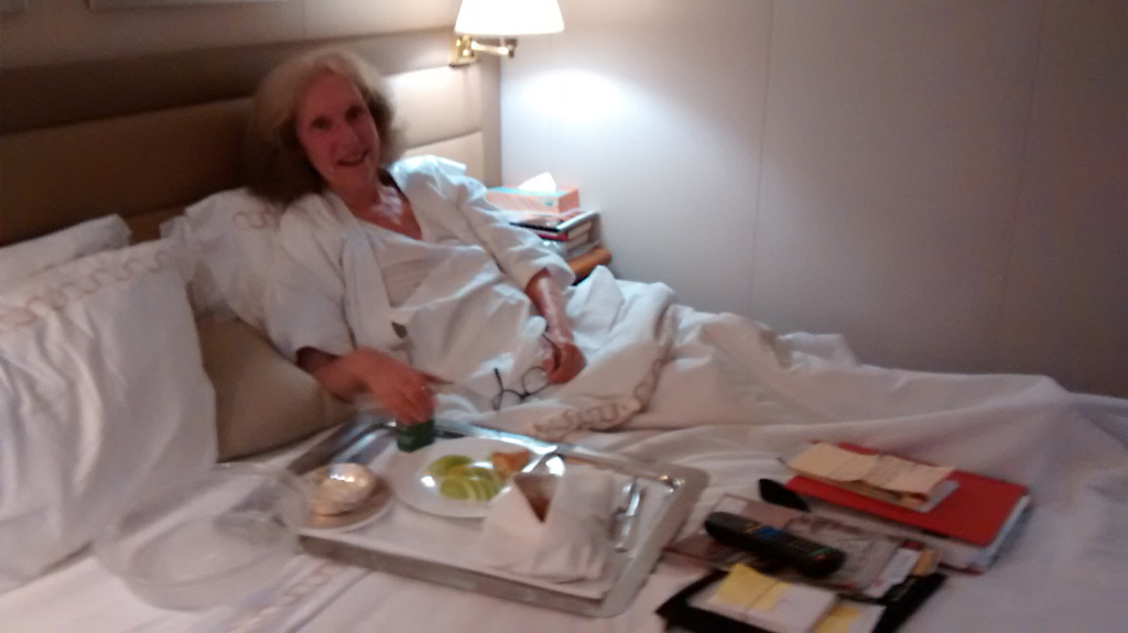 We sailed for Rhodes at 5:30 P.M. and Captain Pontillo announced that heavy weather was expected tonight from 11:00 P.M. to 4:00 A.M. This was not a good evening for me. I ordered the recommended green apples, rolls and ginger ale and weathered (pun intended) the storm in bed as you can see from Bob’s gallery below.