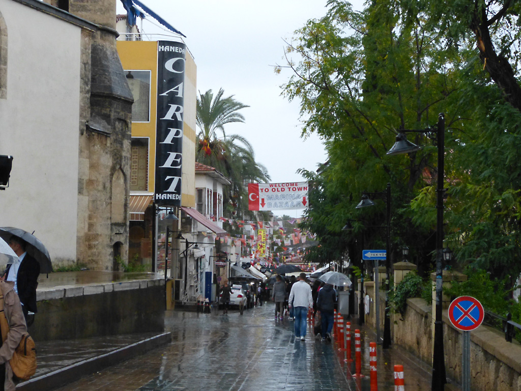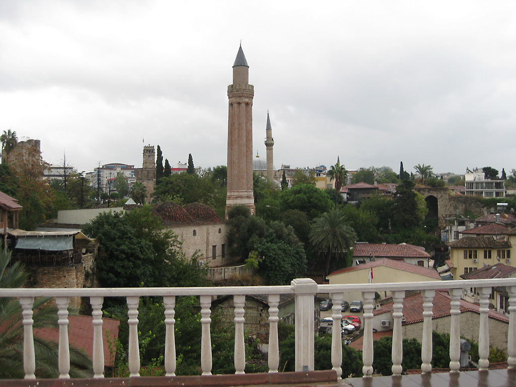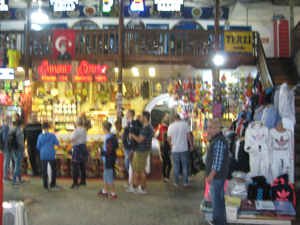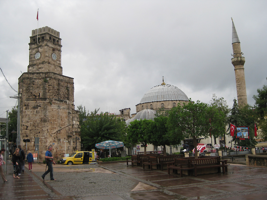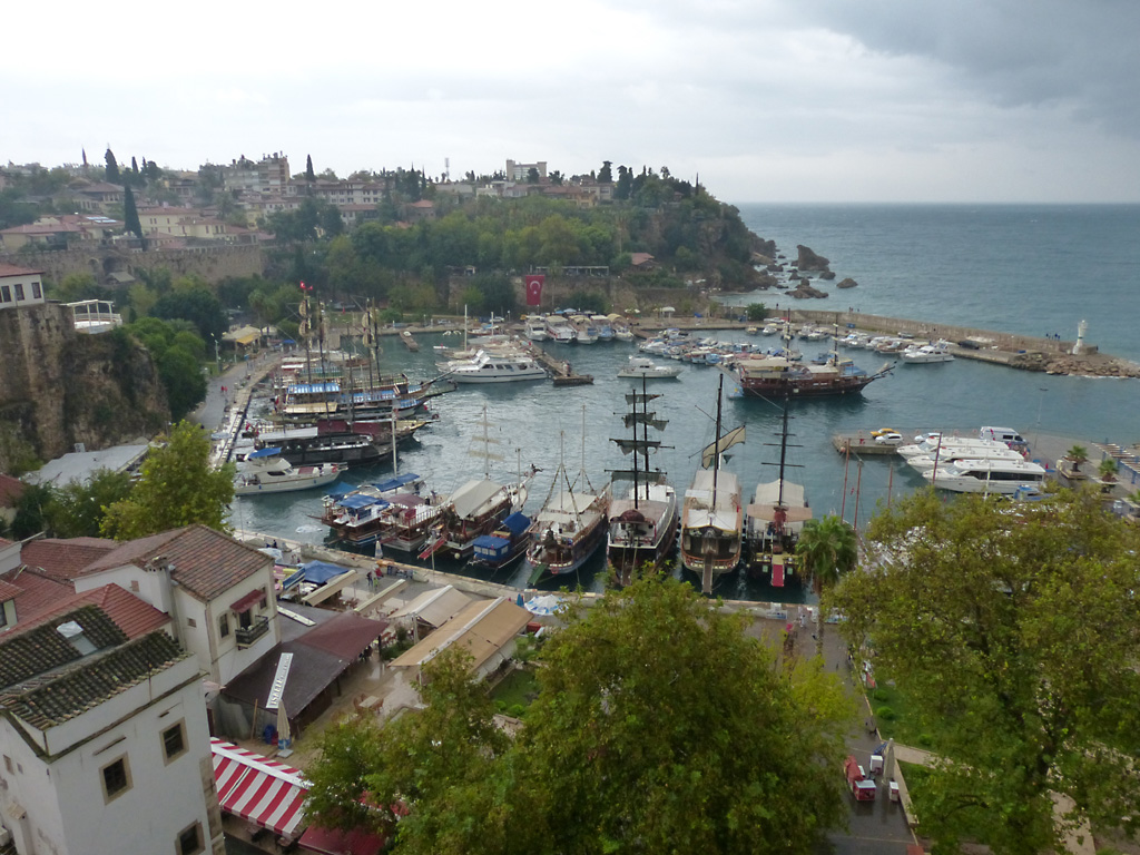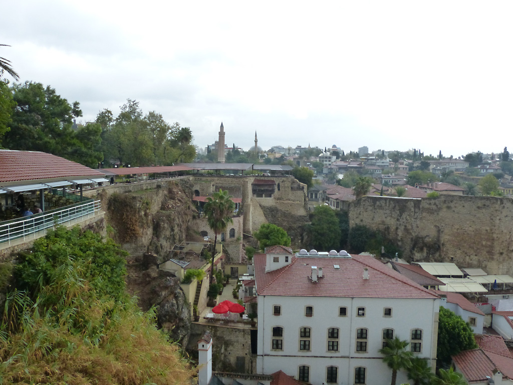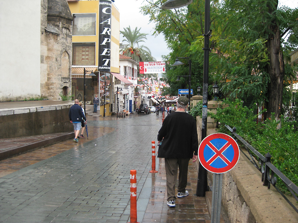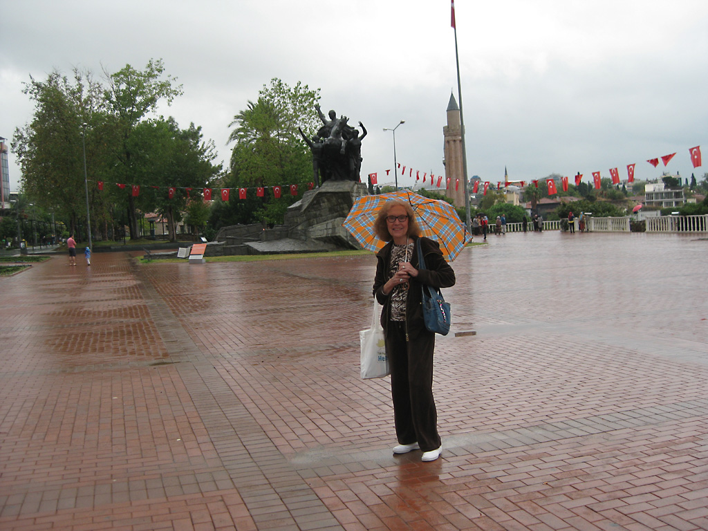 After a leisurely breakfast together Bob and I took the shuttle bus which leaves every half hour from the ship to the town. Took an umbrella but didn’t have much rain until we returned and then had quite a storm all afternoon. Antalya is a modern city with an old town at the lower level. There are minarets all over and many mosques as well. There is a clock tower and fortress ruins all about. In the upper city there were traffic-free walking streets; great for shopping. Another feature was an Istanbul bazaar-like shopping complex of streets in which you can easily get lost. Can you think of a better place to be lost? Bob bought some spices from a colorfully displayed spice shop–he’s the chef in our abode.