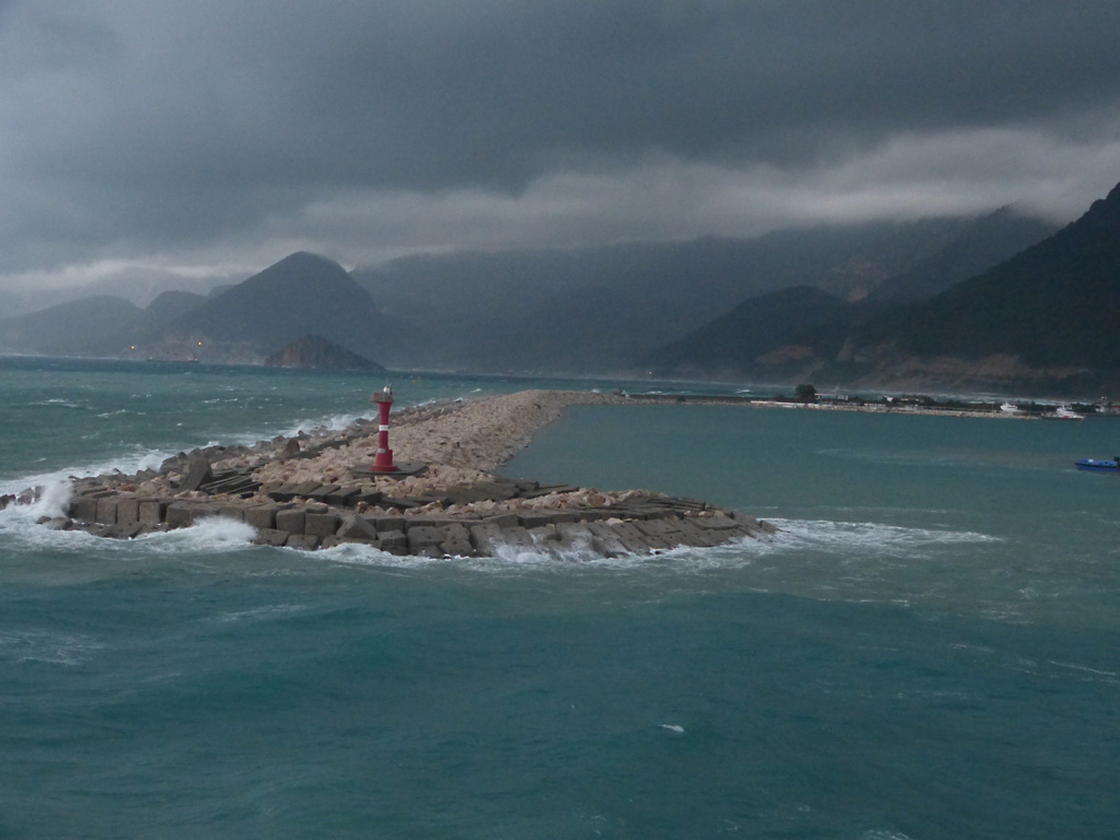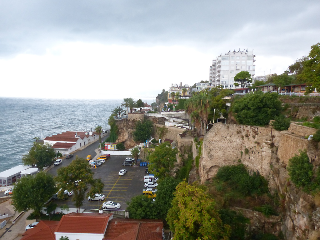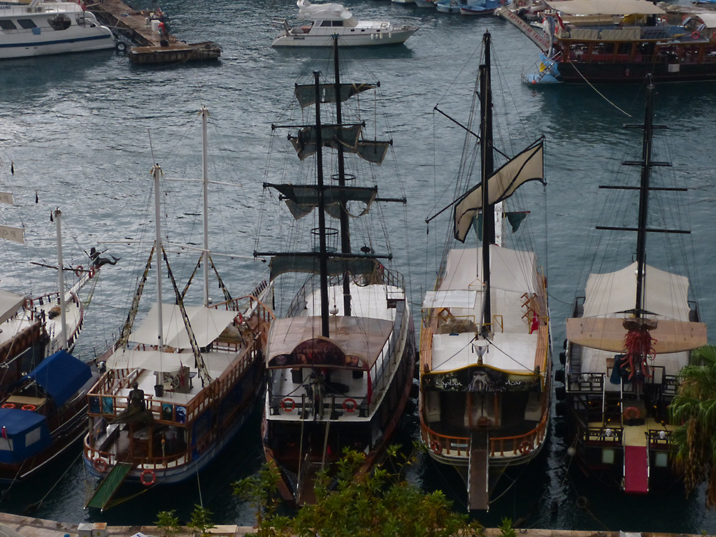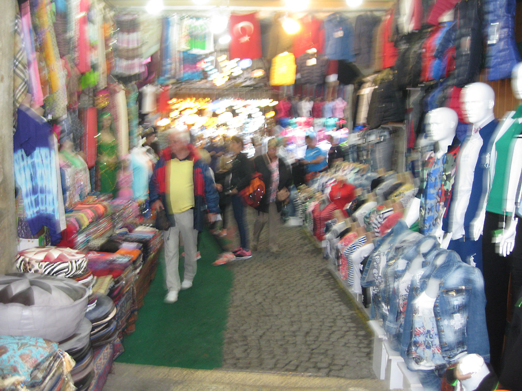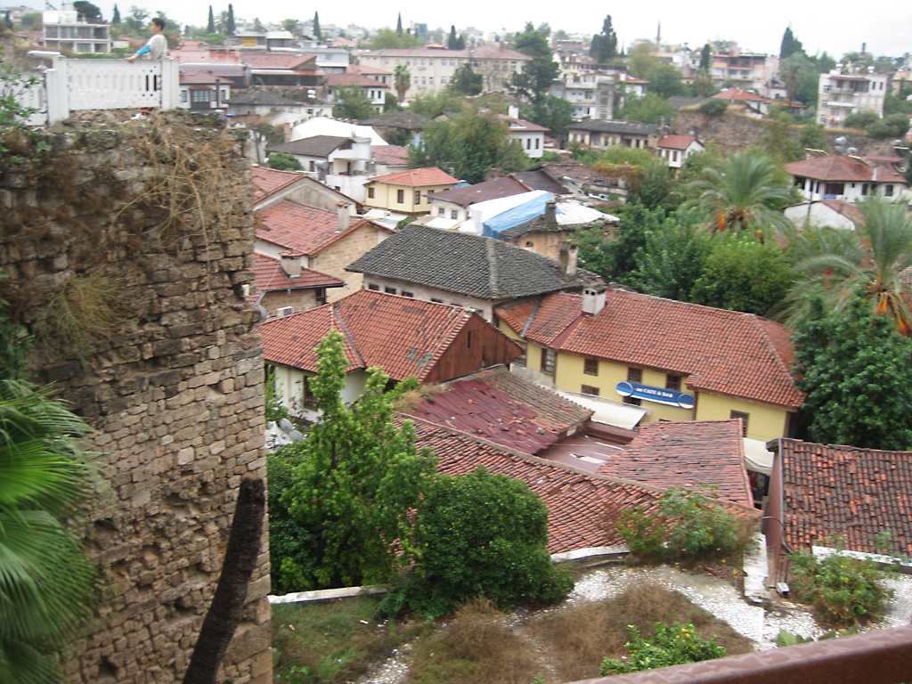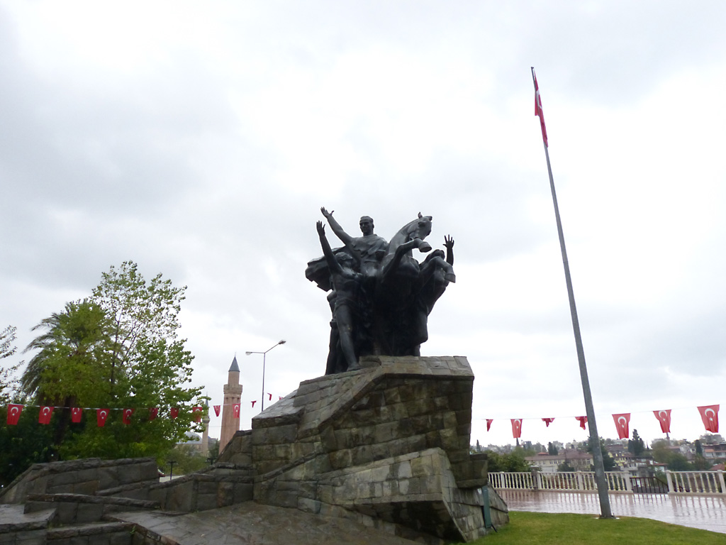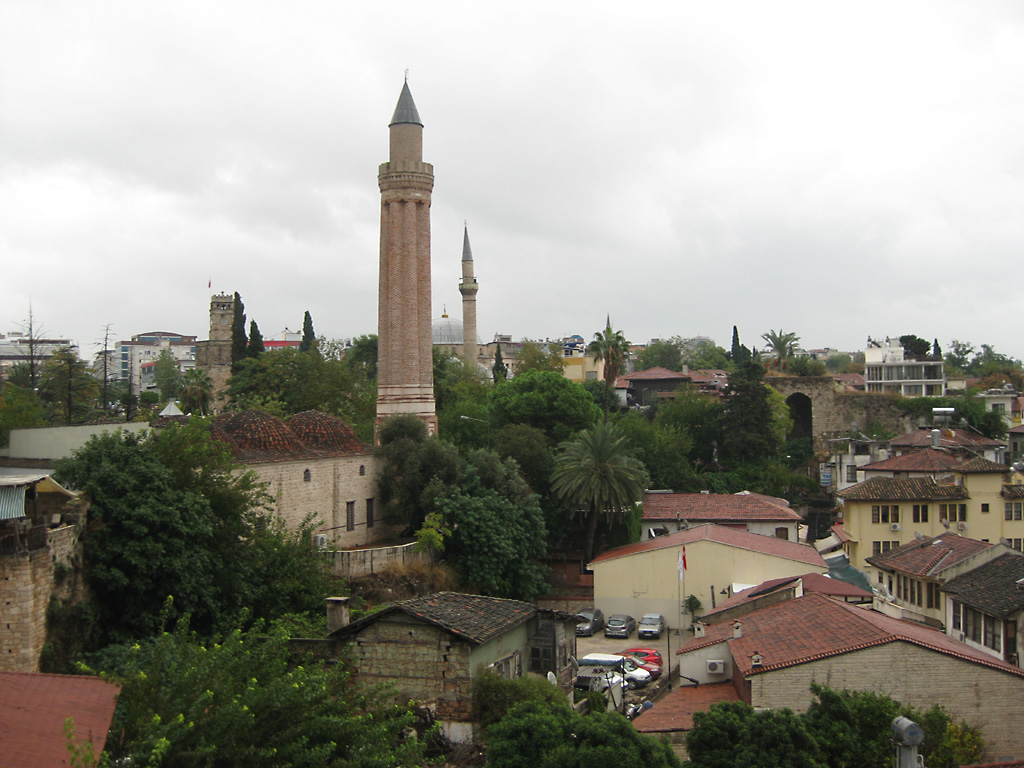 After a leisurely breakfast together Bob and I took the shuttle bus which leaves every half hour from the ship to the town. Took an umbrella but didn’t have much rain until we returned and then had quite a storm all afternoon. Antalya is a modern city with an old town at the lower level. There are minarets all over and many mosques as well. There is a clock tower and fortress ruins all about. In the upper city there were traffic-free walking streets; great for shopping. Another feature was an Istanbul bazaar-like shopping complex of streets in which you can easily get lost. Can you think of a better place to be lost? Bob bought some spices from a colorfully displayed spice shop–he’s the chef in our abode.