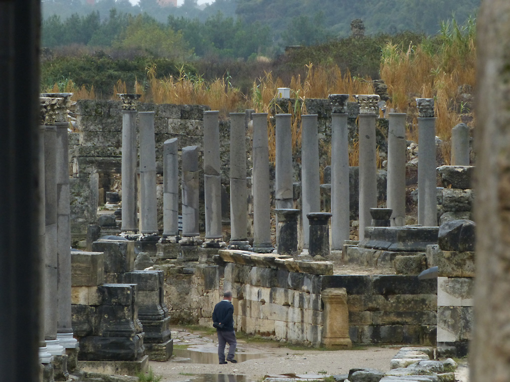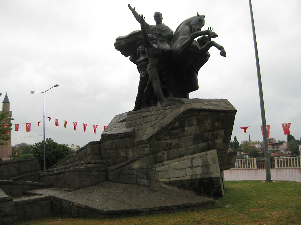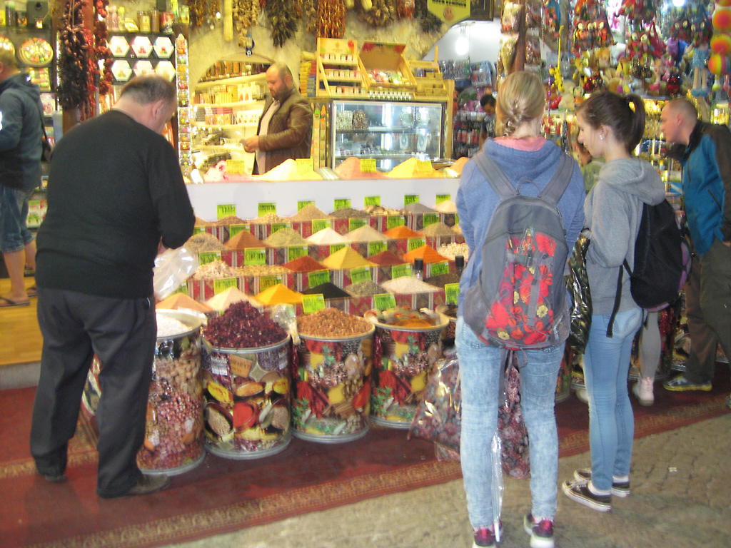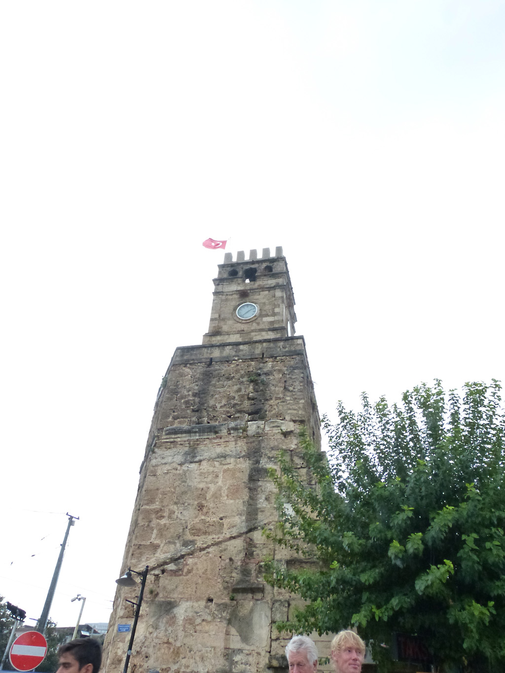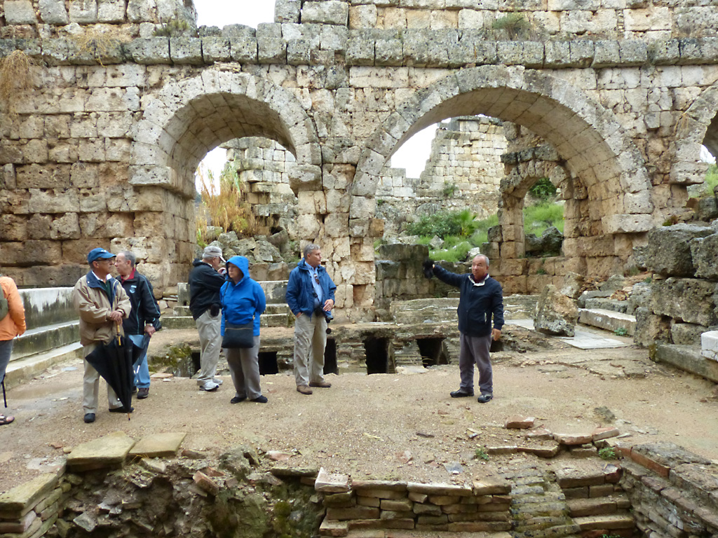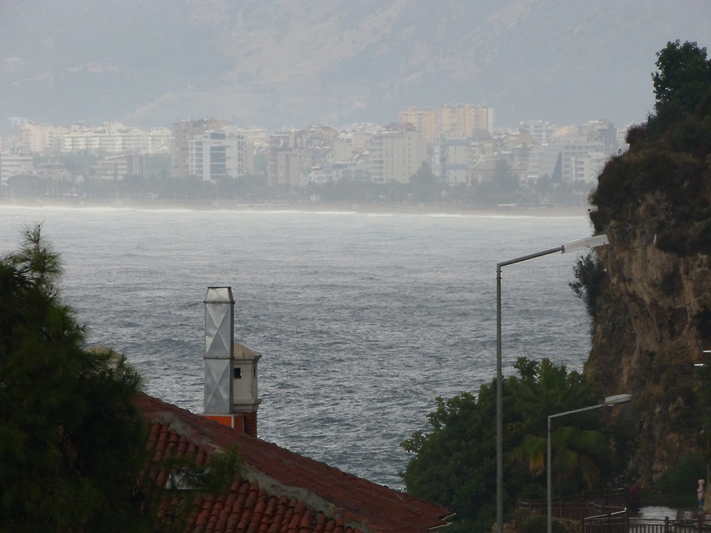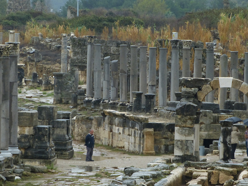 After a leisurely breakfast together Bob and I took the shuttle bus which leaves every half hour from the ship to the town. Took an umbrella but didn’t have much rain until we returned and then had quite a storm all afternoon. Antalya is a modern city with an old town at the lower level. There are minarets all over and many mosques as well. There is a clock tower and fortress ruins all about. In the upper city there were traffic-free walking streets; great for shopping. Another feature was an Istanbul bazaar-like shopping complex of streets in which you can easily get lost. Can you think of a better place to be lost? Bob bought some spices from a colorfully displayed spice shop–he’s the chef in our abode.