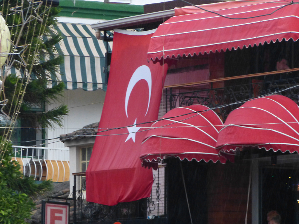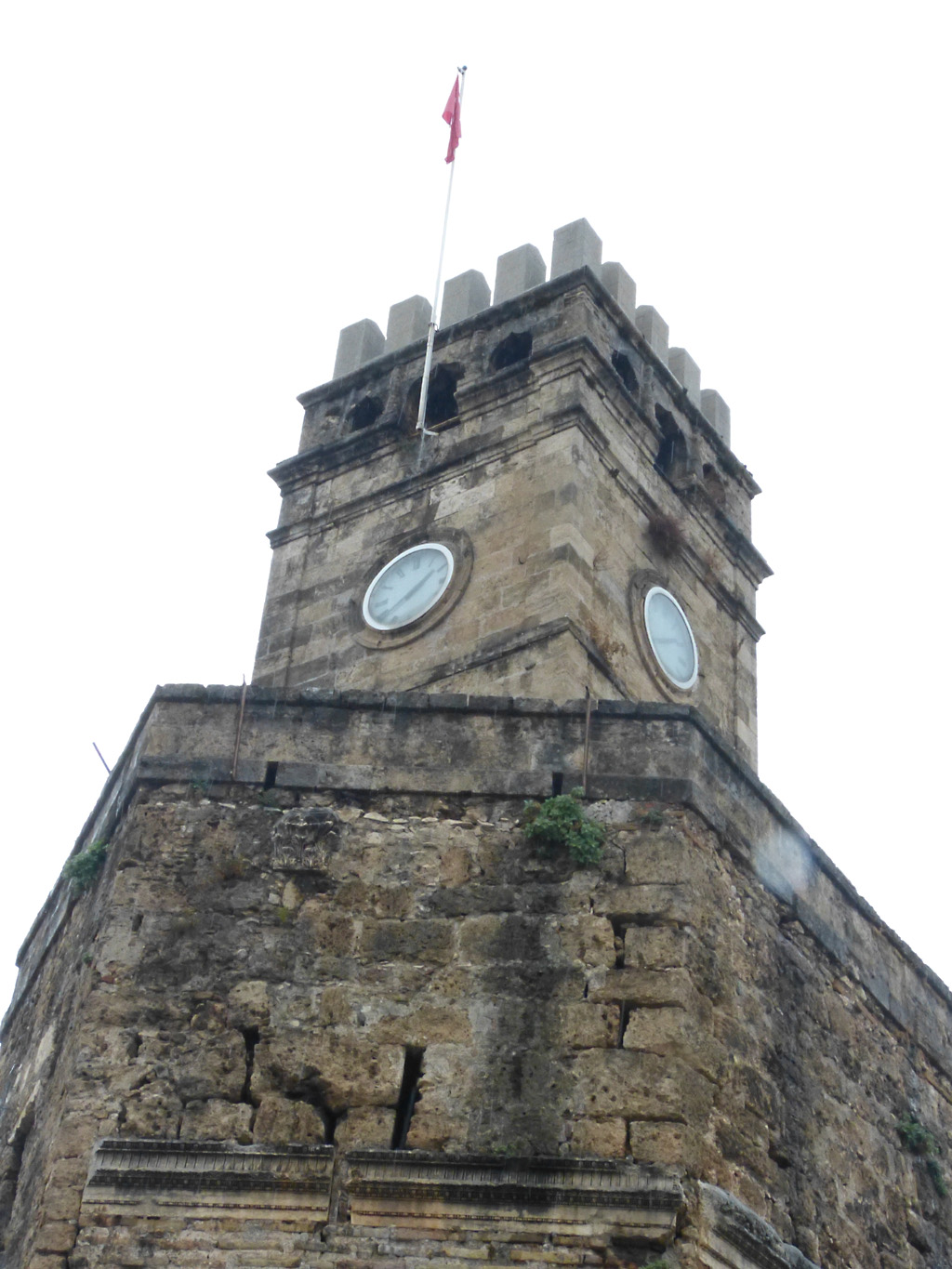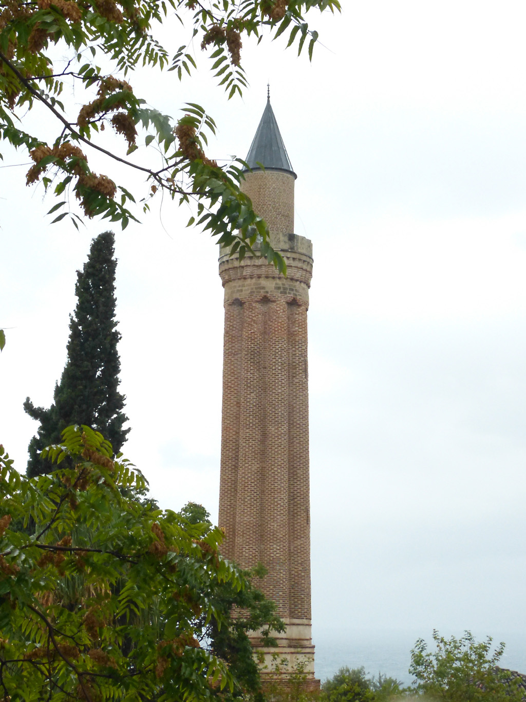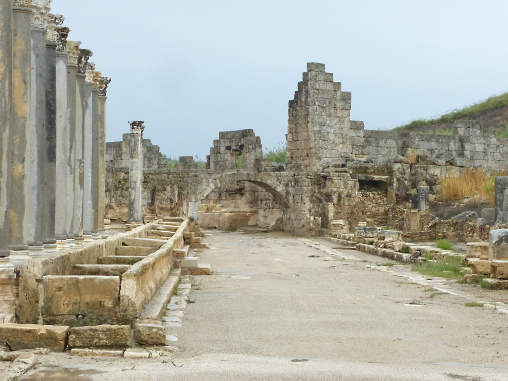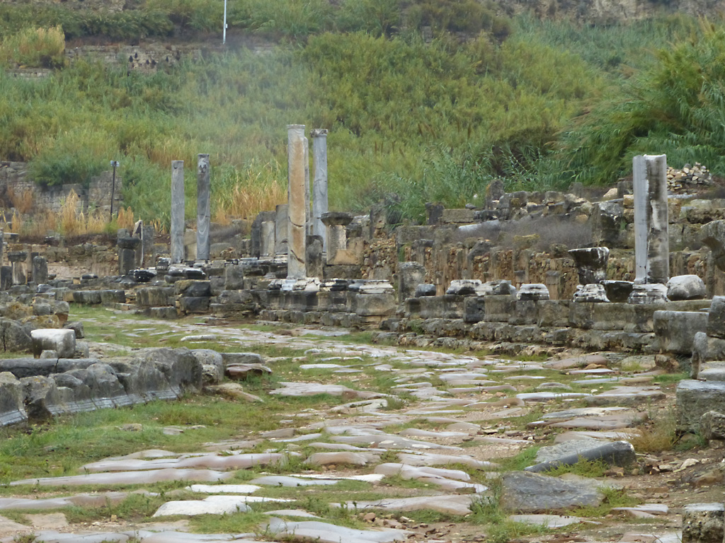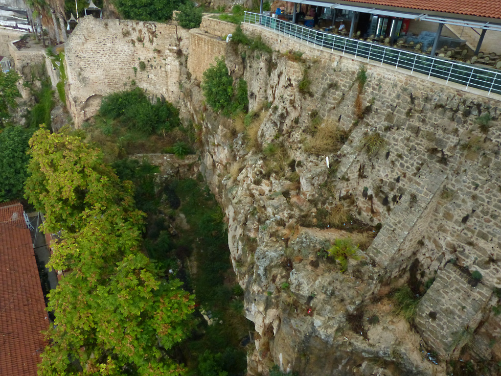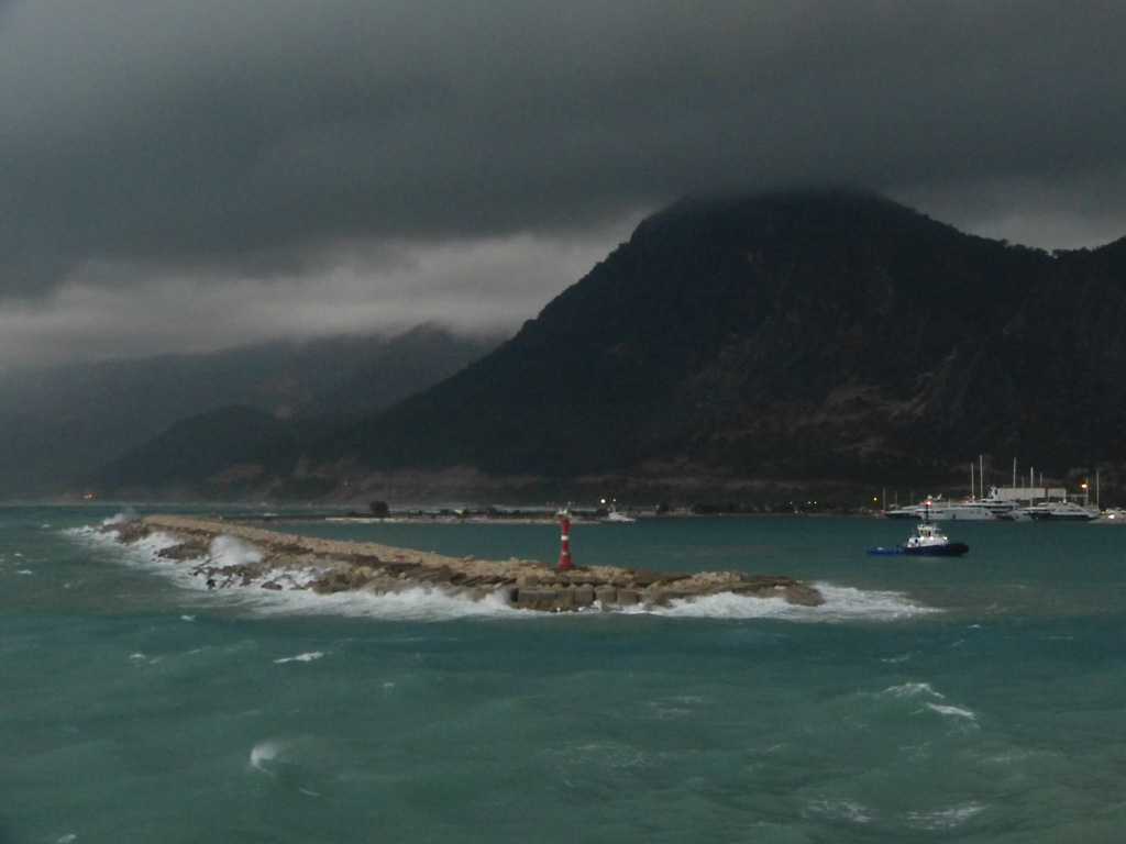 After a leisurely breakfast together Bob and I took the shuttle bus which leaves every half hour from the ship to the town. Took an umbrella but didn’t have much rain until we returned and then had quite a storm all afternoon. Antalya is a modern city with an old town at the lower level. There are minarets all over and many mosques as well. There is a clock tower and fortress ruins all about. In the upper city there were traffic-free walking streets; great for shopping. Another feature was an Istanbul bazaar-like shopping complex of streets in which you can easily get lost. Can you think of a better place to be lost? Bob bought some spices from a colorfully displayed spice shop–he’s the chef in our abode.