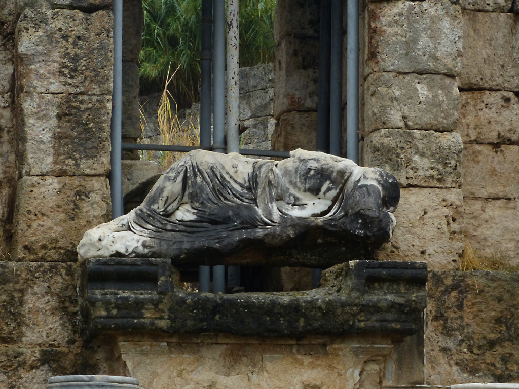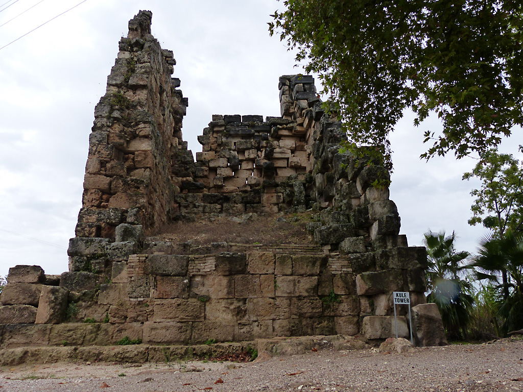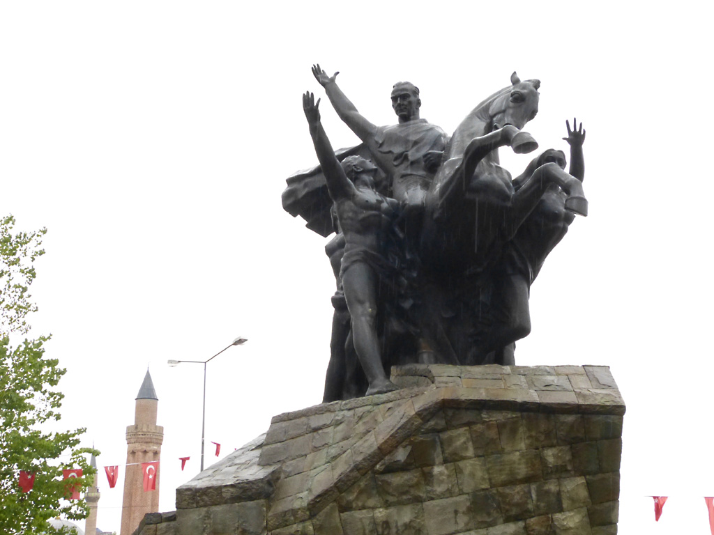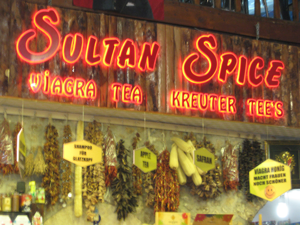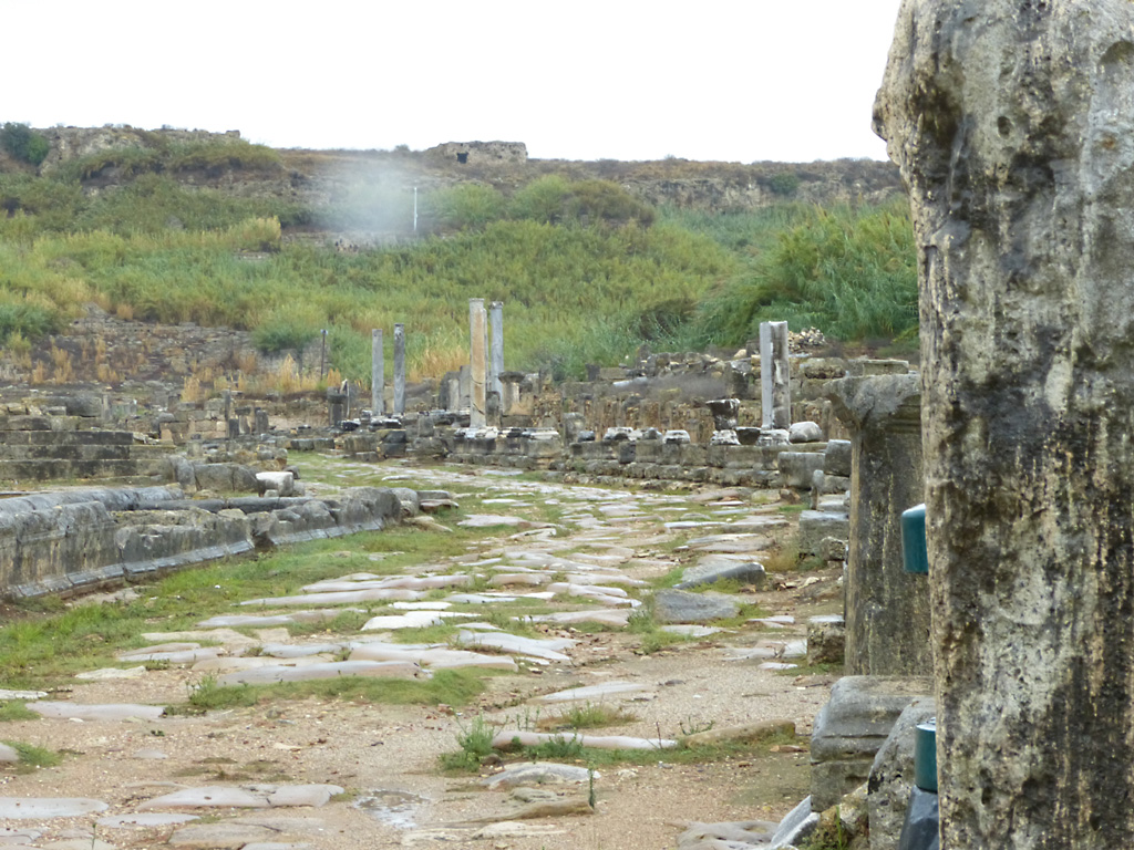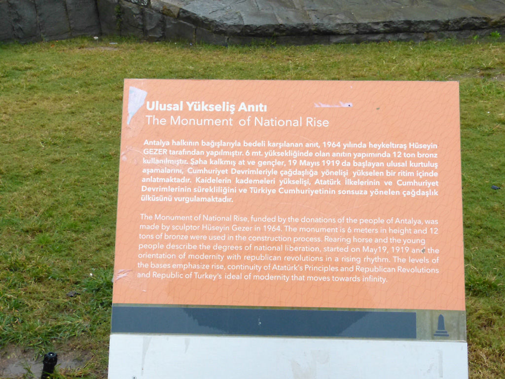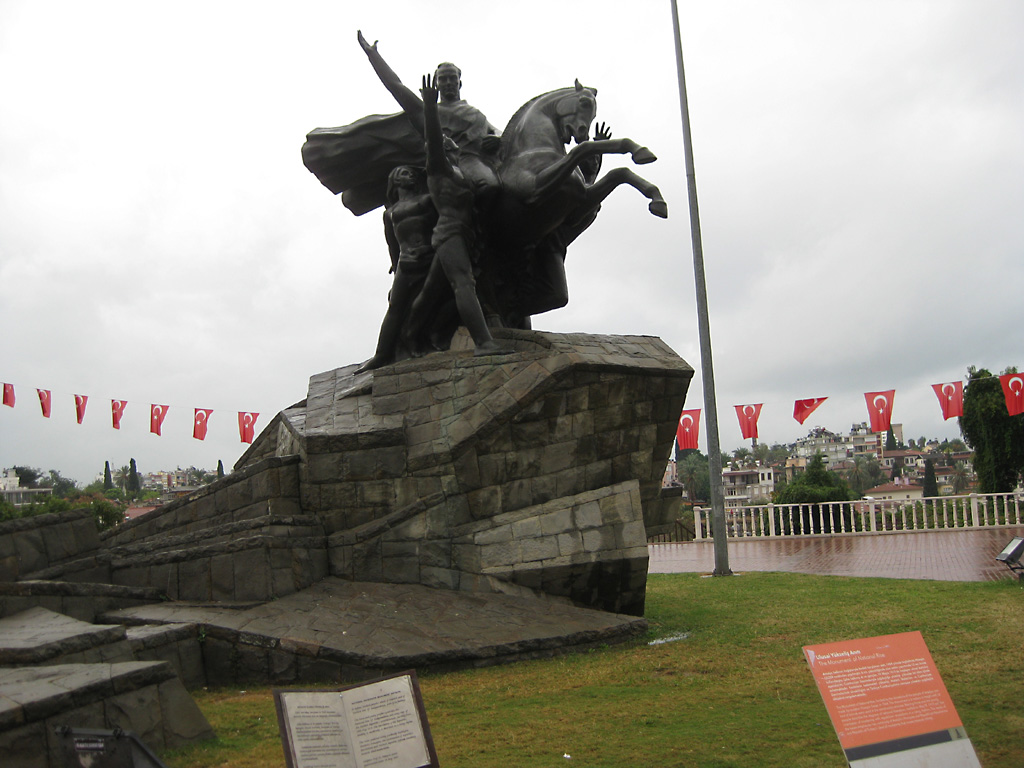 After a leisurely breakfast together Bob and I took the shuttle bus which leaves every half hour from the ship to the town. Took an umbrella but didn’t have much rain until we returned and then had quite a storm all afternoon. Antalya is a modern city with an old town at the lower level. There are minarets all over and many mosques as well. There is a clock tower and fortress ruins all about. In the upper city there were traffic-free walking streets; great for shopping. Another feature was an Istanbul bazaar-like shopping complex of streets in which you can easily get lost. Can you think of a better place to be lost? Bob bought some spices from a colorfully displayed spice shop–he’s the chef in our abode.