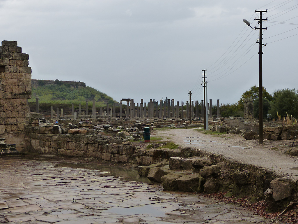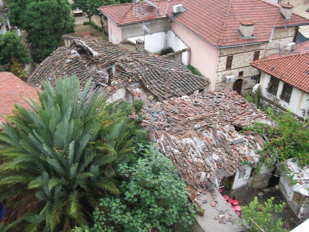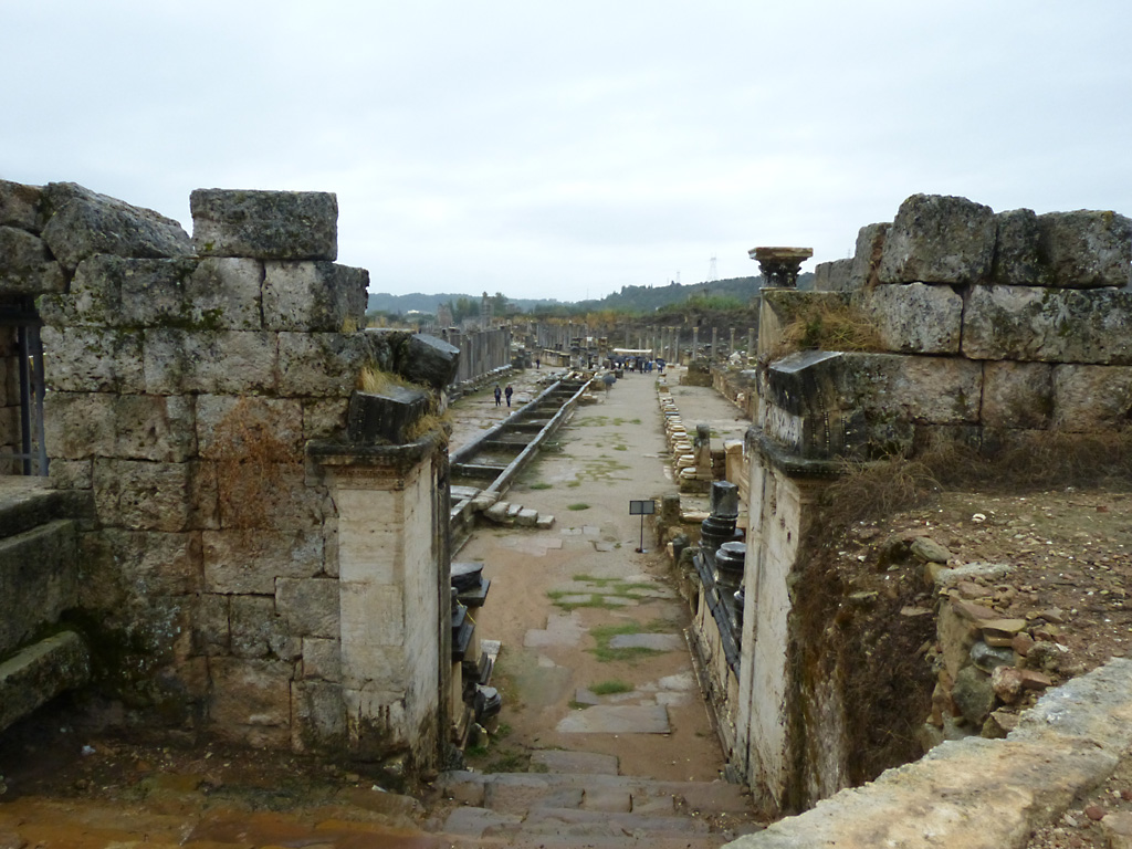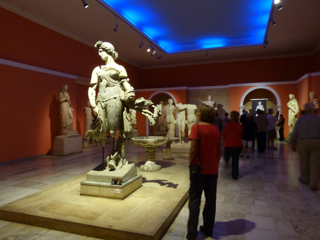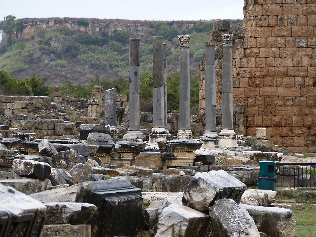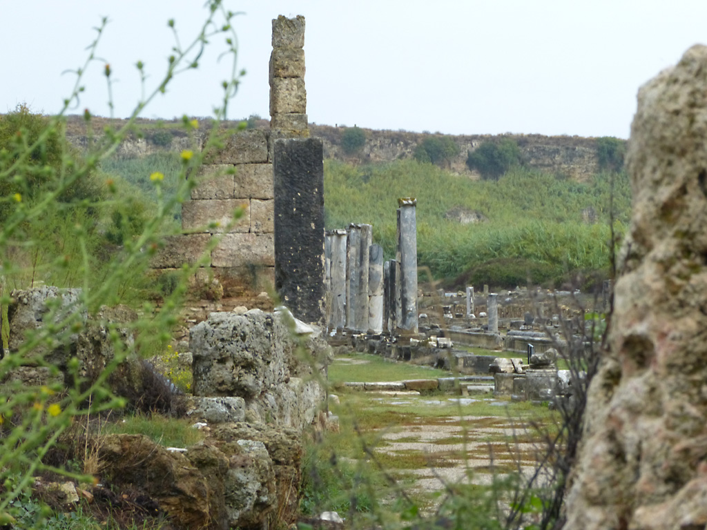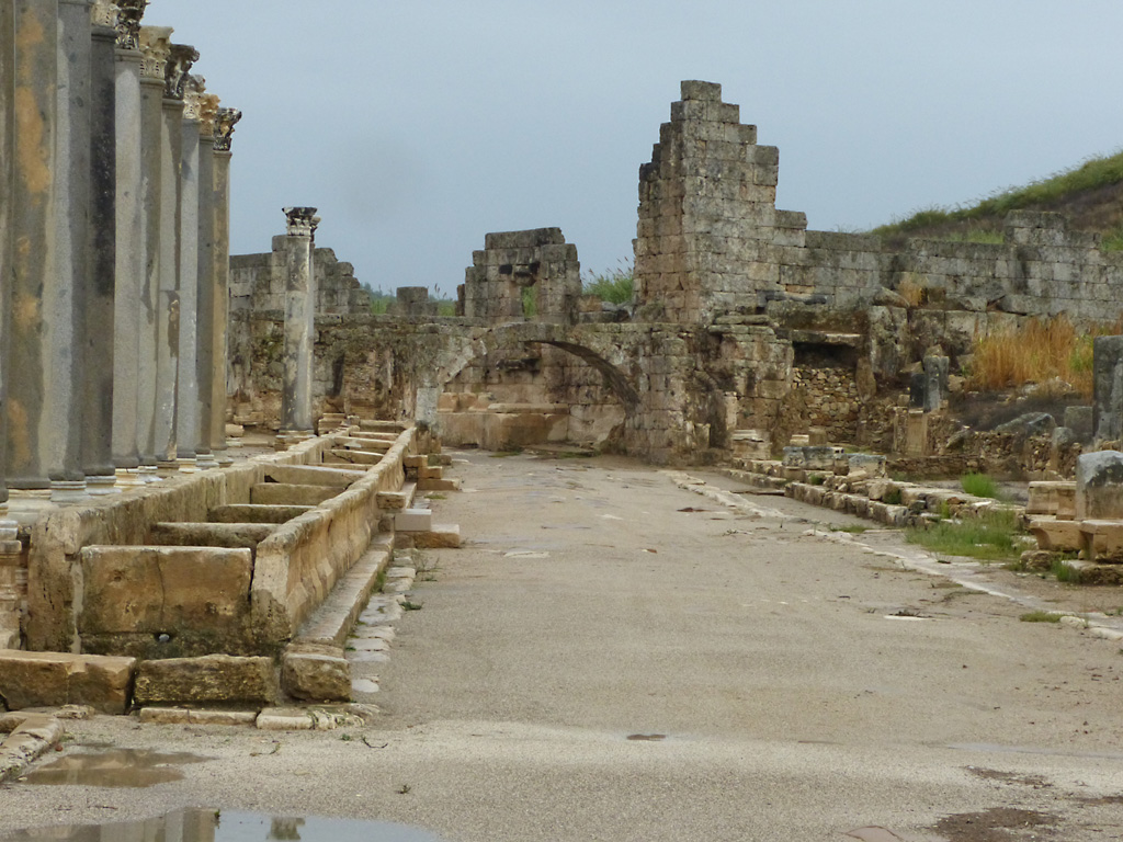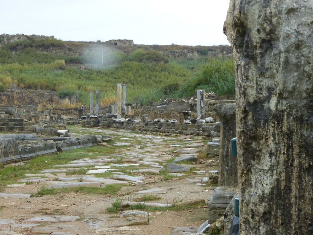 After a leisurely breakfast together Bob and I took the shuttle bus which leaves every half hour from the ship to the town. Took an umbrella but didn’t have much rain until we returned and then had quite a storm all afternoon. Antalya is a modern city with an old town at the lower level. There are minarets all over and many mosques as well. There is a clock tower and fortress ruins all about. In the upper city there were traffic-free walking streets; great for shopping. Another feature was an Istanbul bazaar-like shopping complex of streets in which you can easily get lost. Can you think of a better place to be lost? Bob bought some spices from a colorfully displayed spice shop–he’s the chef in our abode.