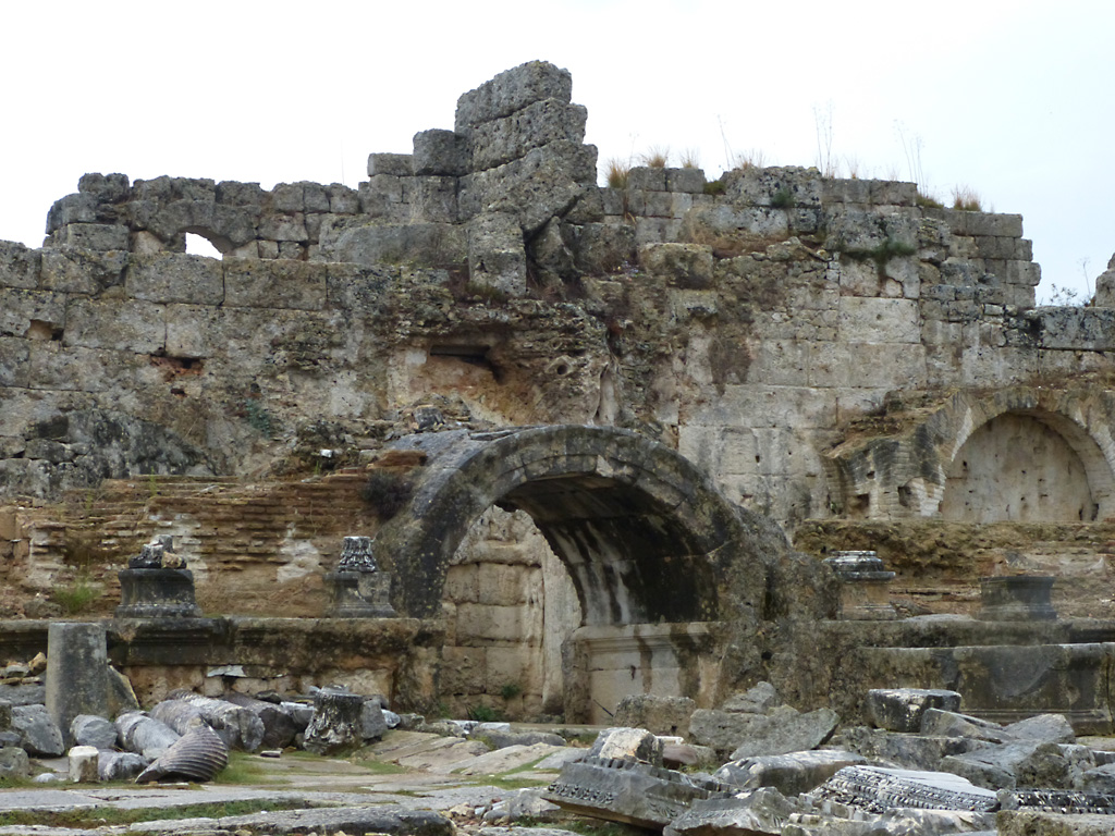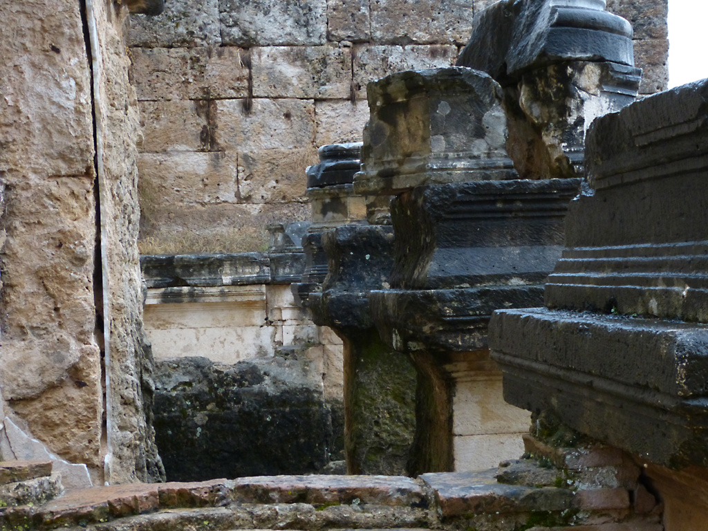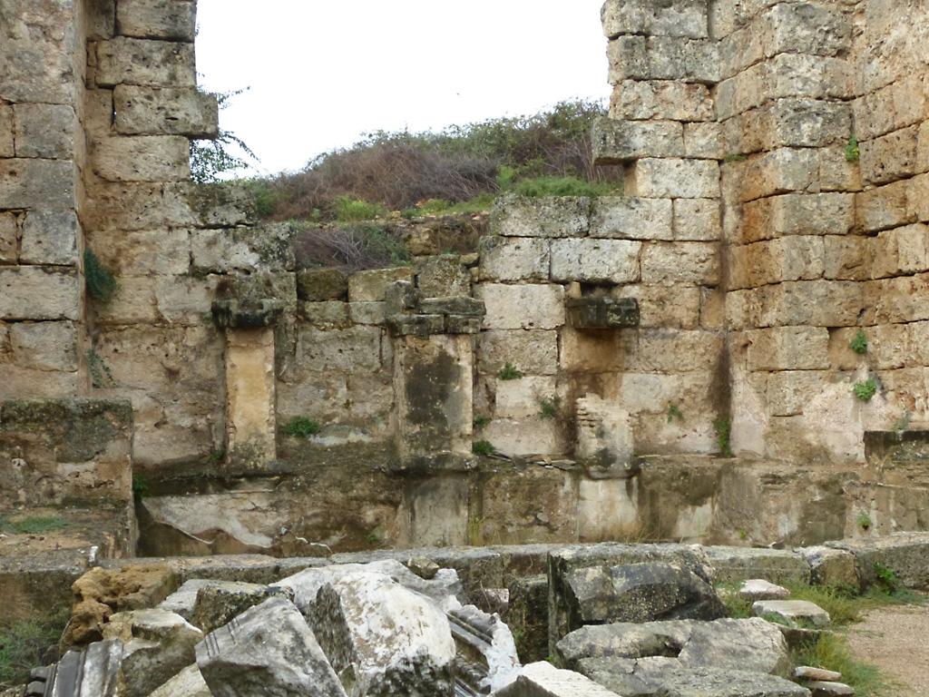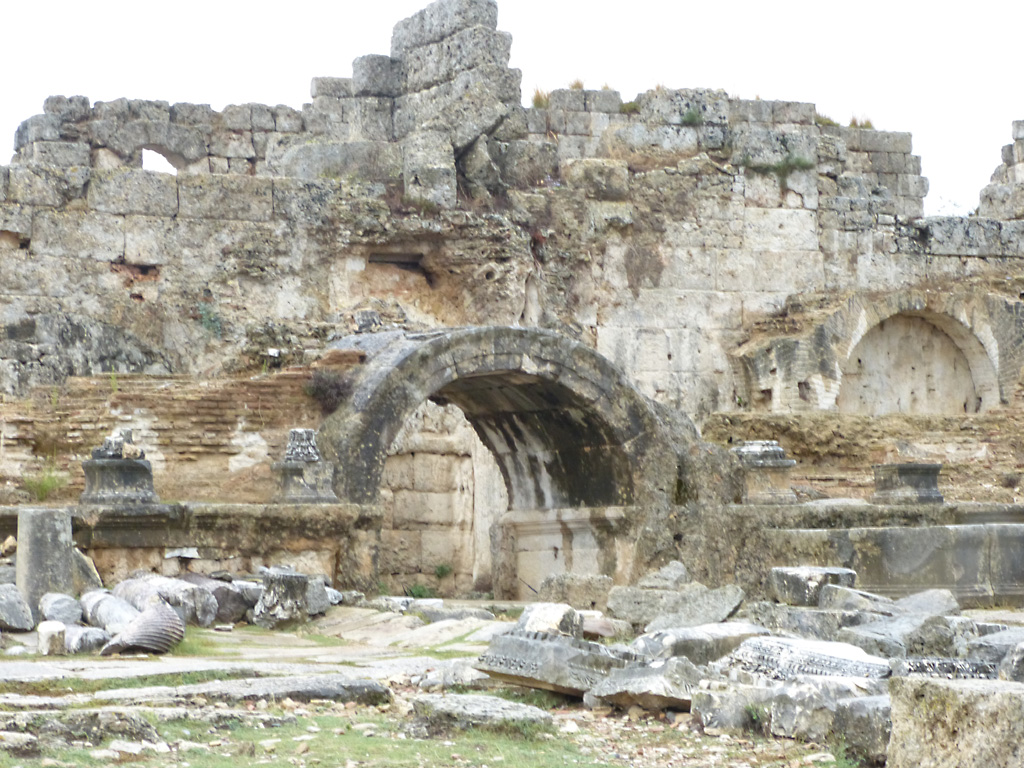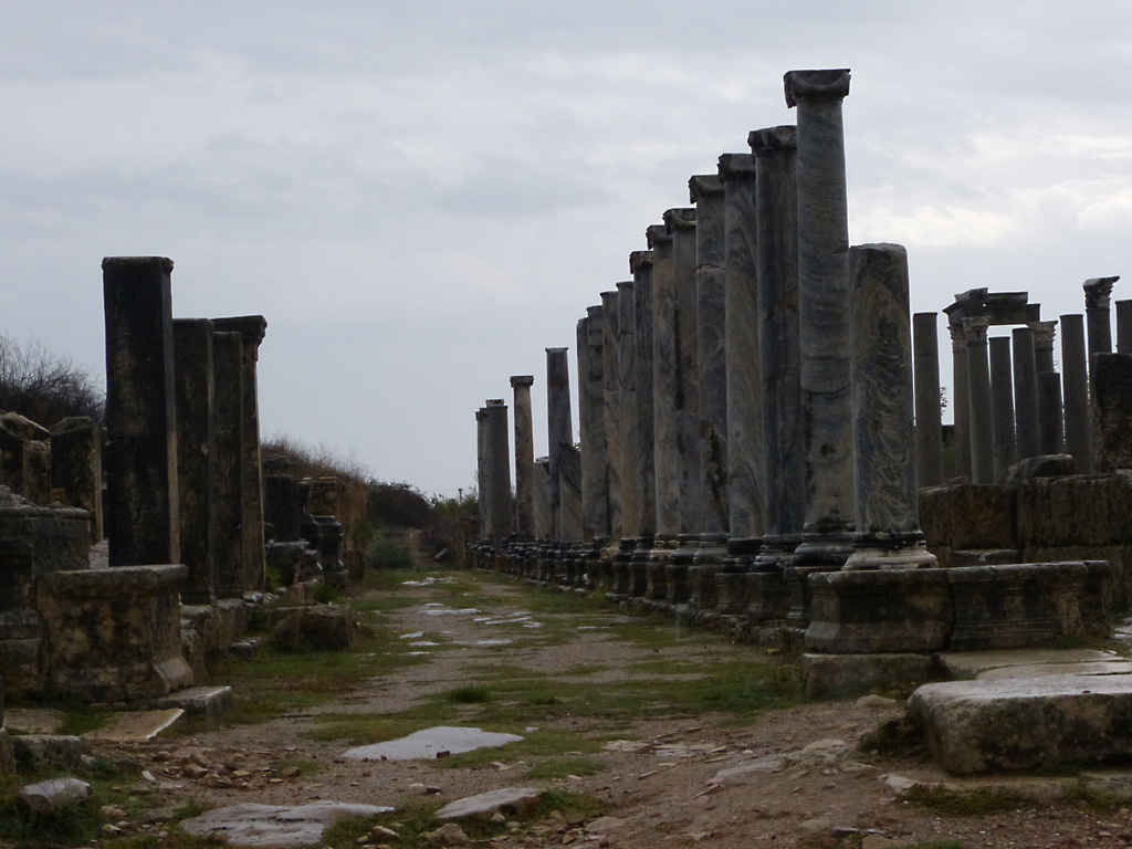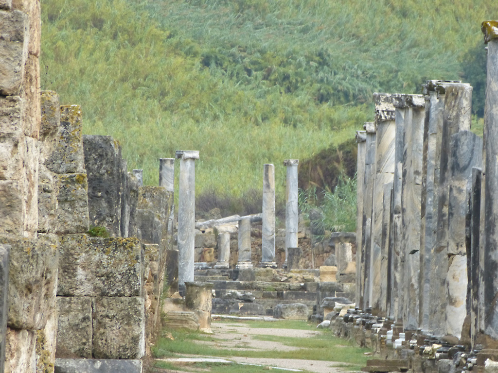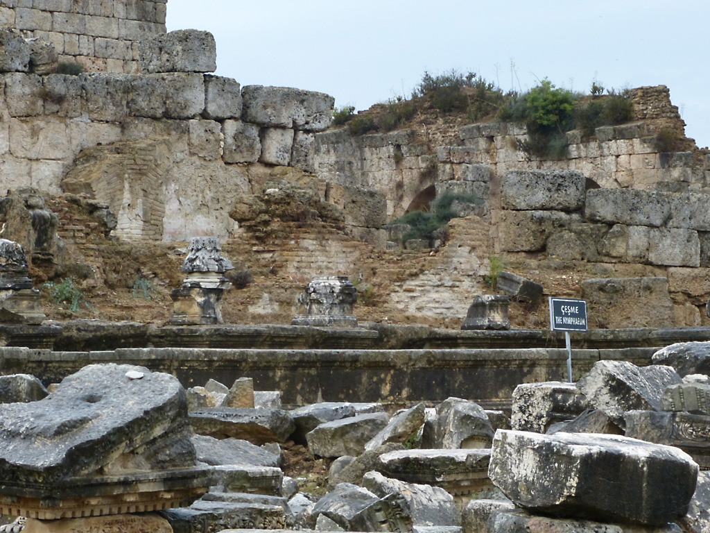 After a leisurely breakfast together Bob and I took the shuttle bus which leaves every half hour from the ship to the town. Took an umbrella but didn’t have much rain until we returned and then had quite a storm all afternoon. Antalya is a modern city with an old town at the lower level. There are minarets all over and many mosques as well. There is a clock tower and fortress ruins all about. In the upper city there were traffic-free walking streets; great for shopping. Another feature was an Istanbul bazaar-like shopping complex of streets in which you can easily get lost. Can you think of a better place to be lost? Bob bought some spices from a colorfully displayed spice shop–he’s the chef in our abode.