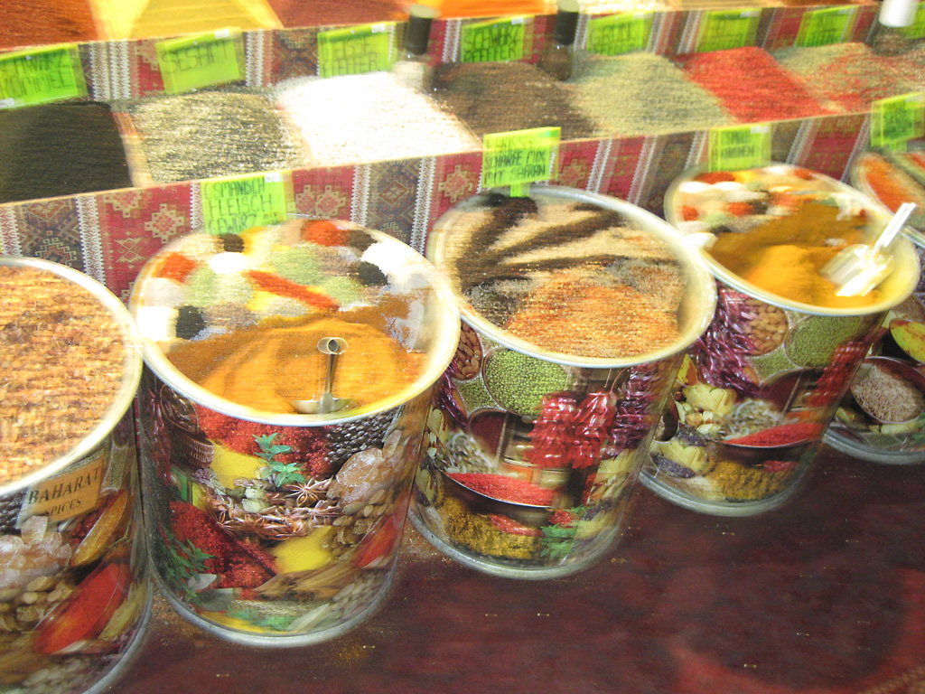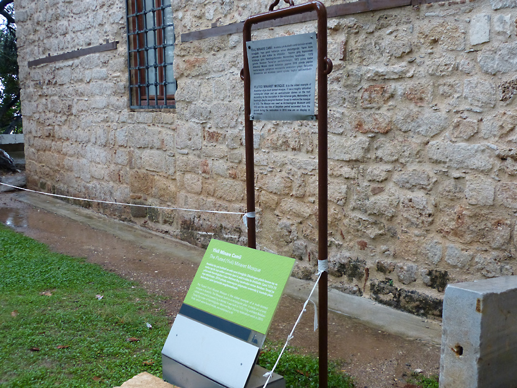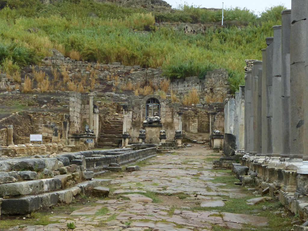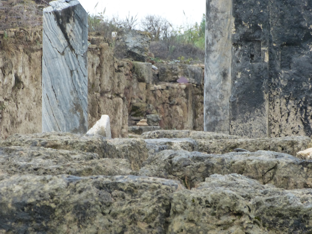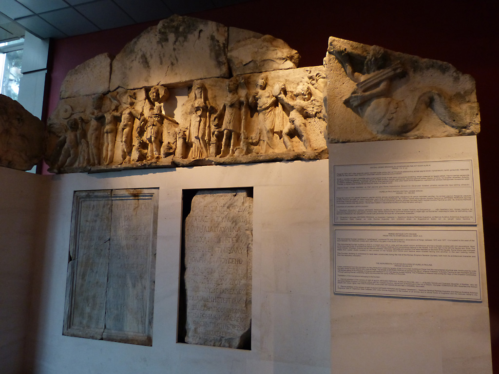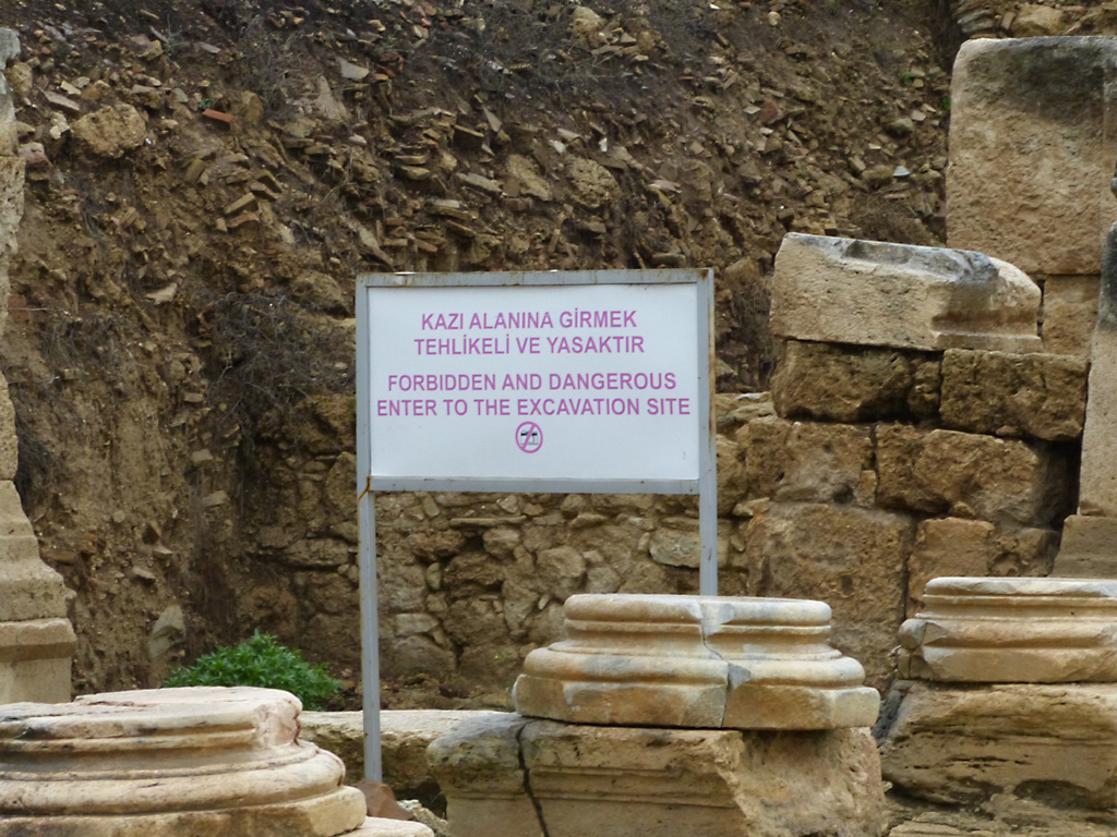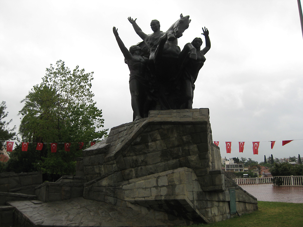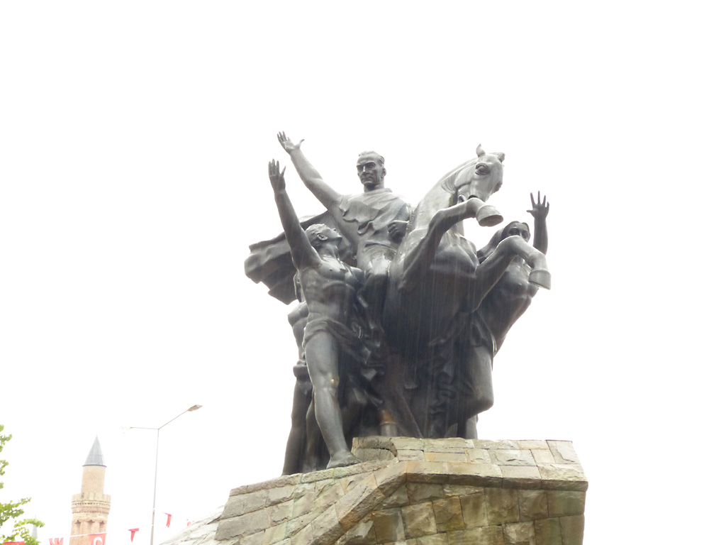 After a leisurely breakfast together Bob and I took the shuttle bus which leaves every half hour from the ship to the town. Took an umbrella but didn’t have much rain until we returned and then had quite a storm all afternoon. Antalya is a modern city with an old town at the lower level. There are minarets all over and many mosques as well. There is a clock tower and fortress ruins all about. In the upper city there were traffic-free walking streets; great for shopping. Another feature was an Istanbul bazaar-like shopping complex of streets in which you can easily get lost. Can you think of a better place to be lost? Bob bought some spices from a colorfully displayed spice shop–he’s the chef in our abode.