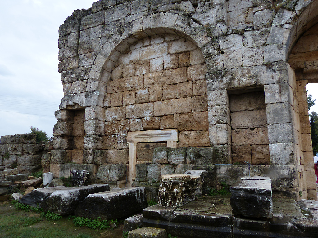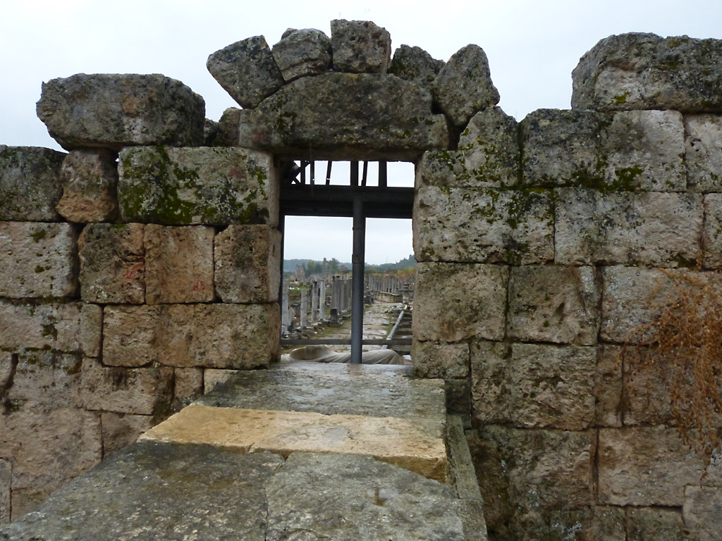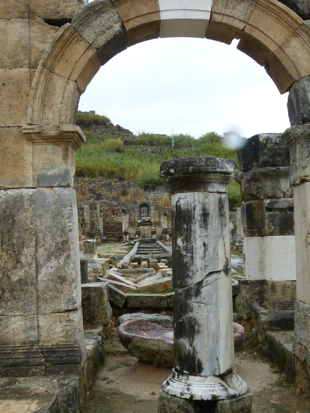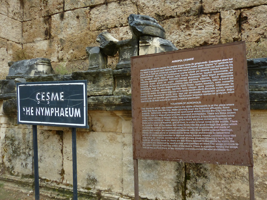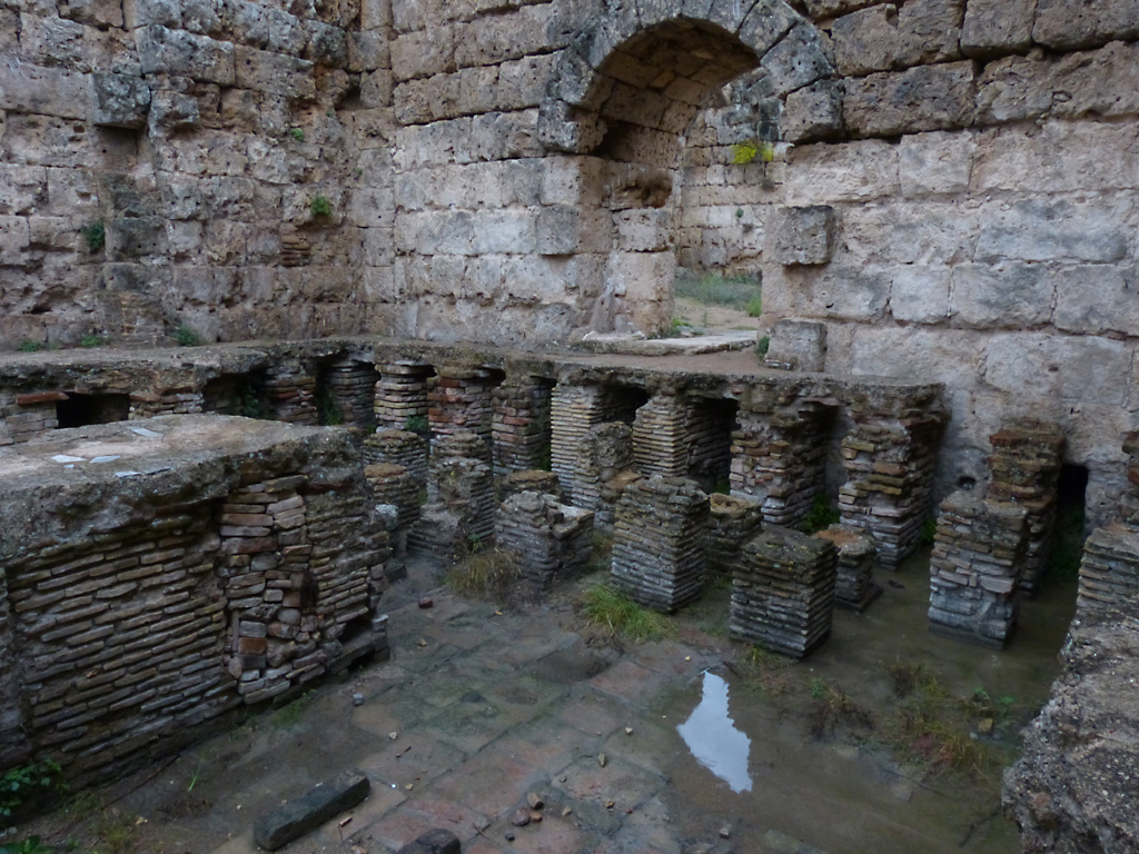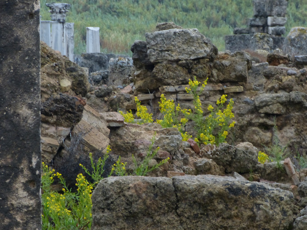 After a leisurely breakfast together Bob and I took the shuttle bus which leaves every half hour from the ship to the town. Took an umbrella but didn’t have much rain until we returned and then had quite a storm all afternoon. Antalya is a modern city with an old town at the lower level. There are minarets all over and many mosques as well. There is a clock tower and fortress ruins all about. In the upper city there were traffic-free walking streets; great for shopping. Another feature was an Istanbul bazaar-like shopping complex of streets in which you can easily get lost. Can you think of a better place to be lost? Bob bought some spices from a colorfully displayed spice shop–he’s the chef in our abode.